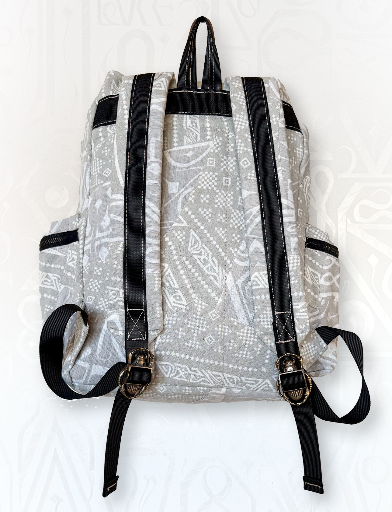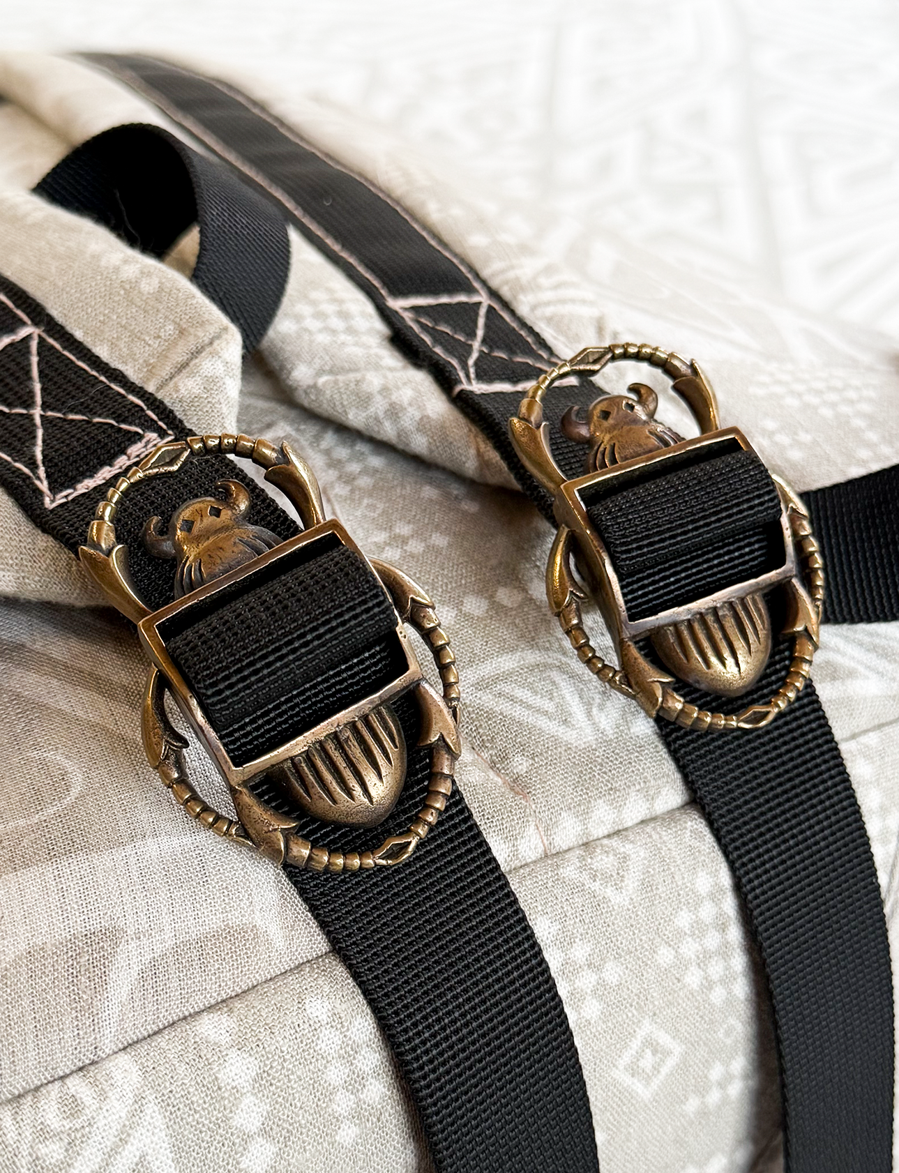 Scrappack Backpacks are made with durable canvas as the main structure, with custom brass Scarab loops for the buckles. Includes many interior and exterior pockets (zipper or snap), an interior padded laptop sleeve and reinforced water resistant lining.